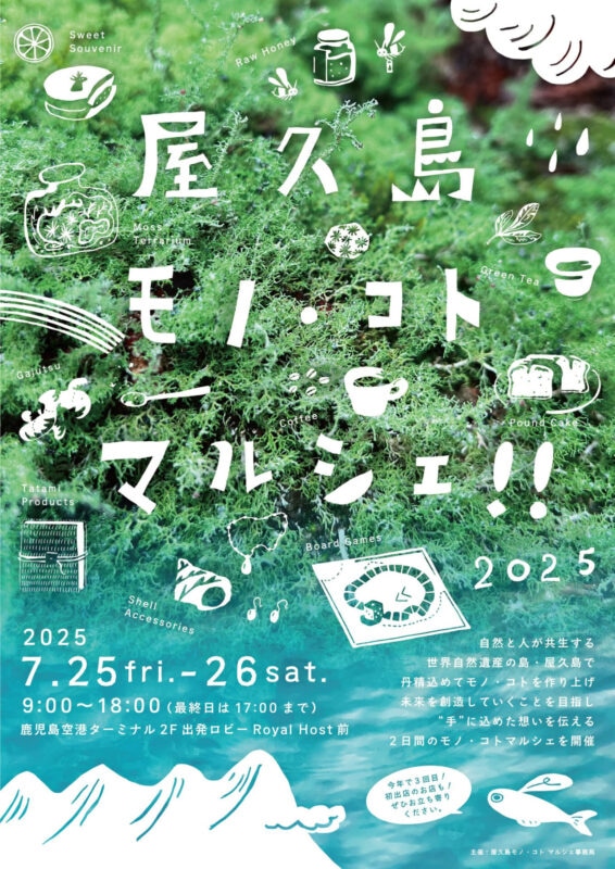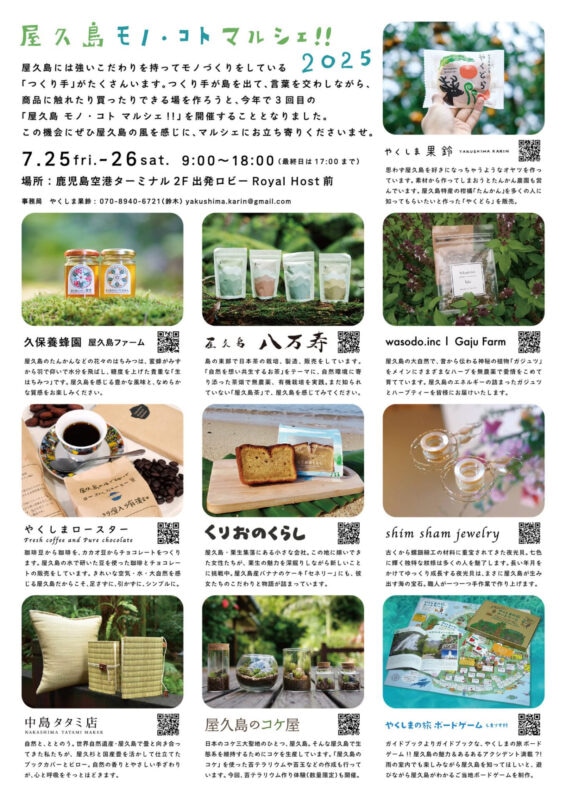 今年で3回目となる屋久島島内のつくり手が集まる「屋久島モノ・コトマルシェ!!2025」が7月25日(金)・26日(土)、鹿児島空港2階出発ロビーで開催されました。たくさんのご来場誠にありがとうございました。